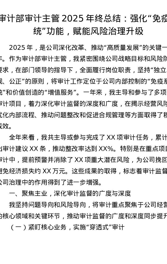 审计部审计主管2025年终总结:强化“免疫系统”功能,赋能风险治理升级