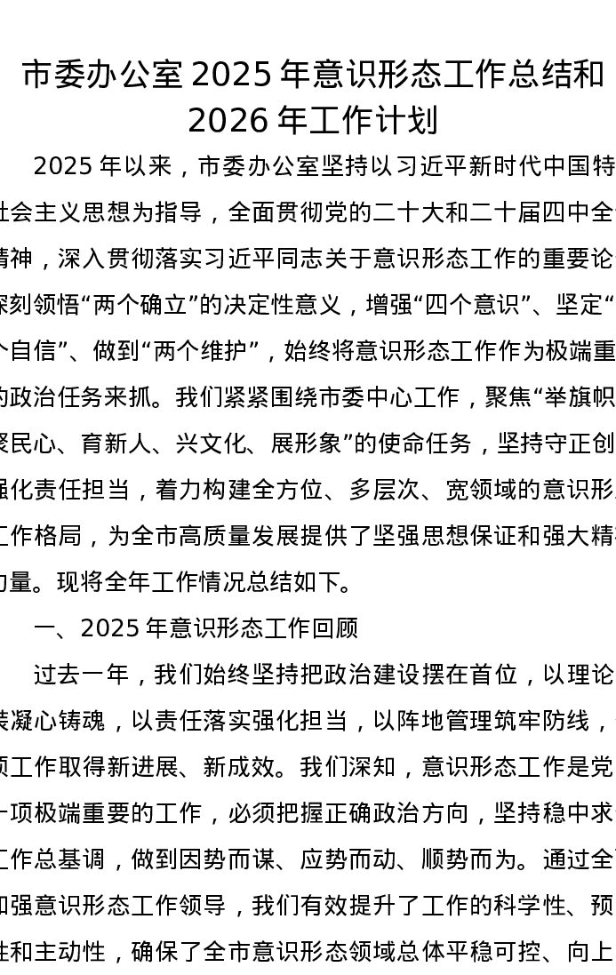 市委办公室2025年意识形态工作总结和2026年工作计划