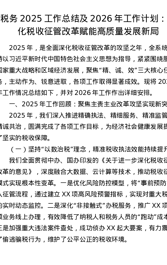 税务2025工作总结及2026年工作计划:深化税收征管改革 赋能高质量发展新局