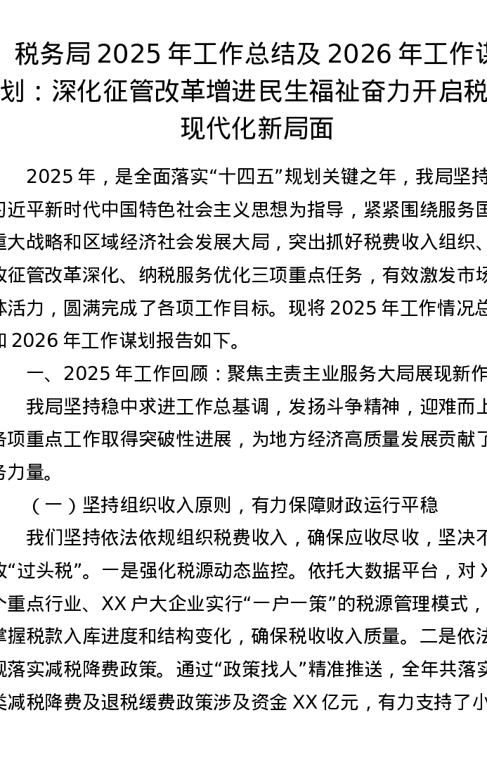 税务局2025年工作总结及2026年工作谋划:深化征管改革增进民生福祉 奋力开启税收现代化新局面