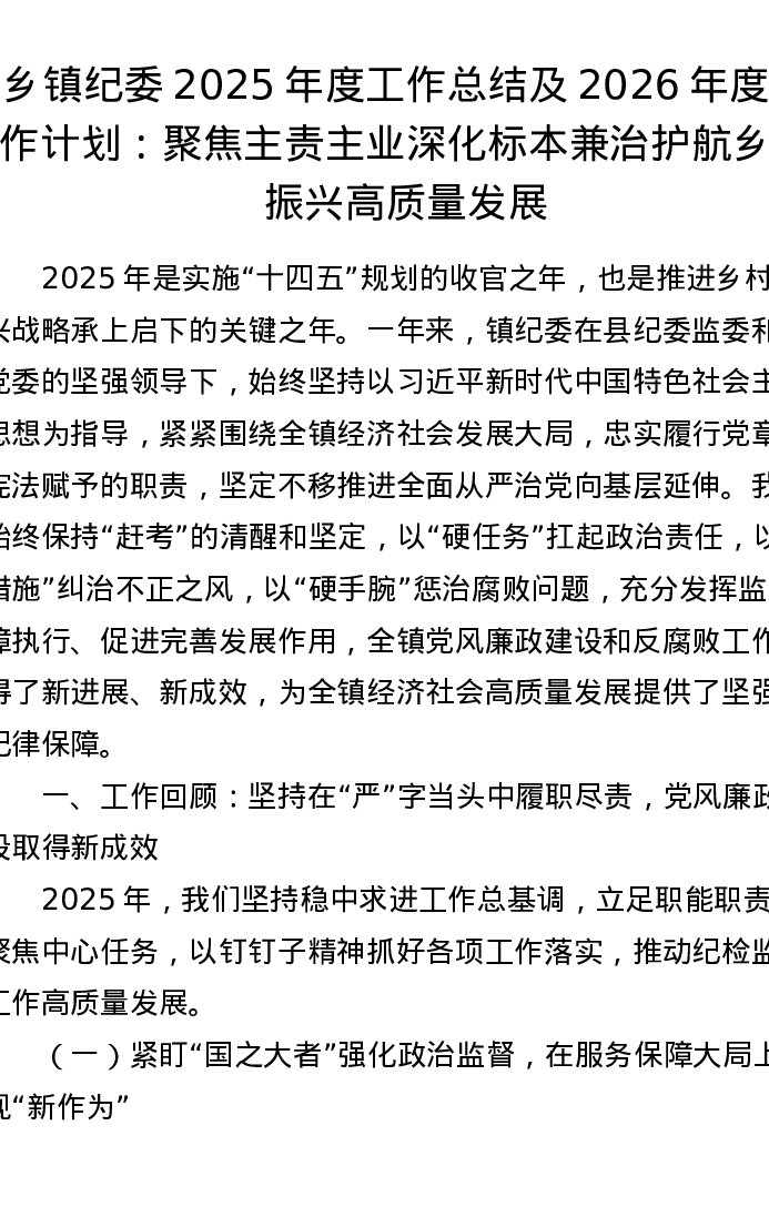 乡镇纪委2025年度工作总结及2026年度工作计划:聚焦主责主业深化标本兼治 护航乡村振兴高质量发展