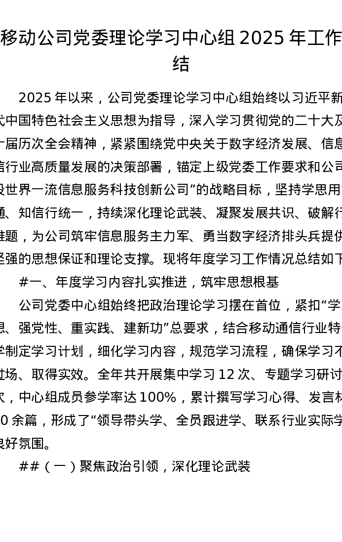 移动公司党委理论学习中心组2025年工作总结(8034字)