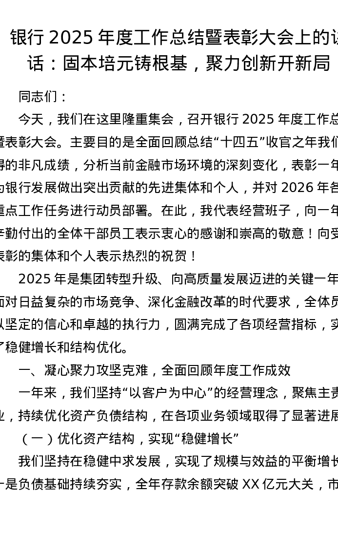 银行2025年度工作总结暨表彰大会上的讲话:固本培元铸根基,聚力创新开新局