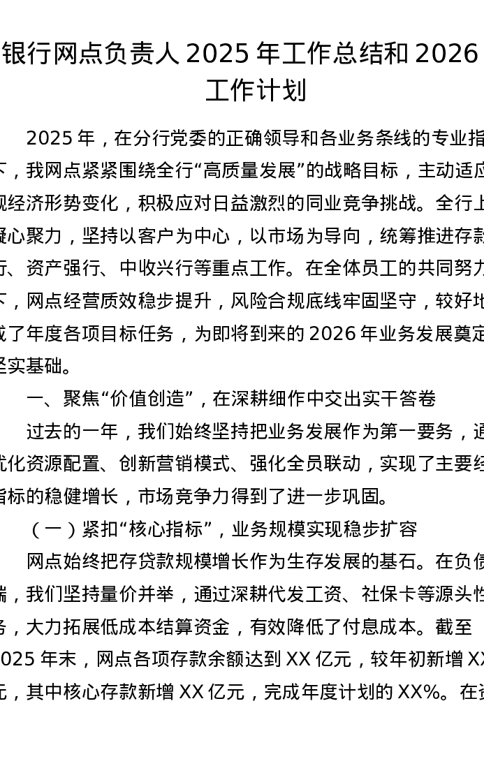 银行网点负责人2025年工作总结和2026年工作计划