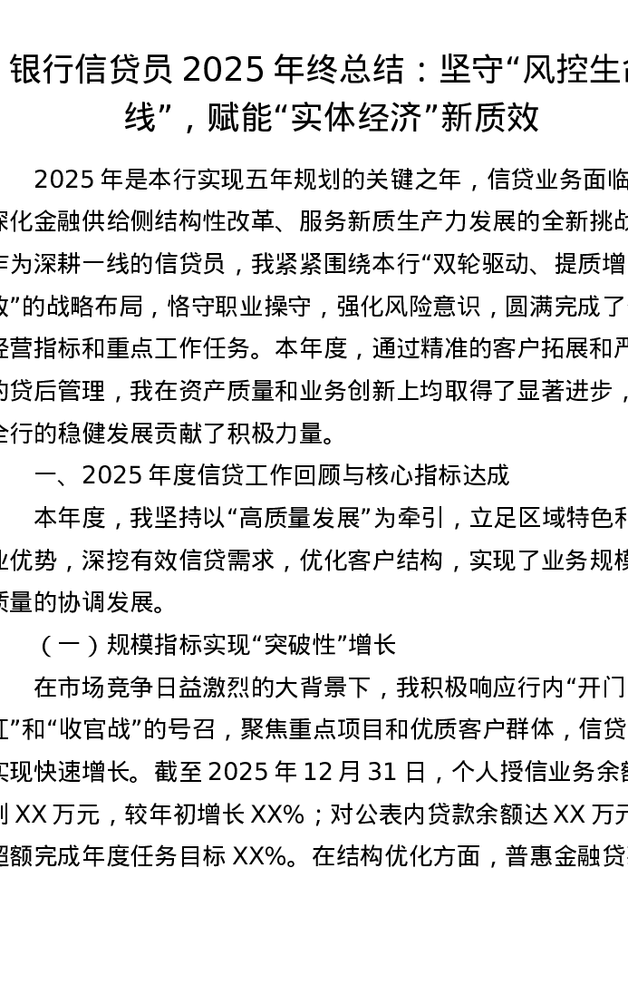 银行信贷员2025年终总结:坚守“风控生命线”,赋能“实体经济”新质效