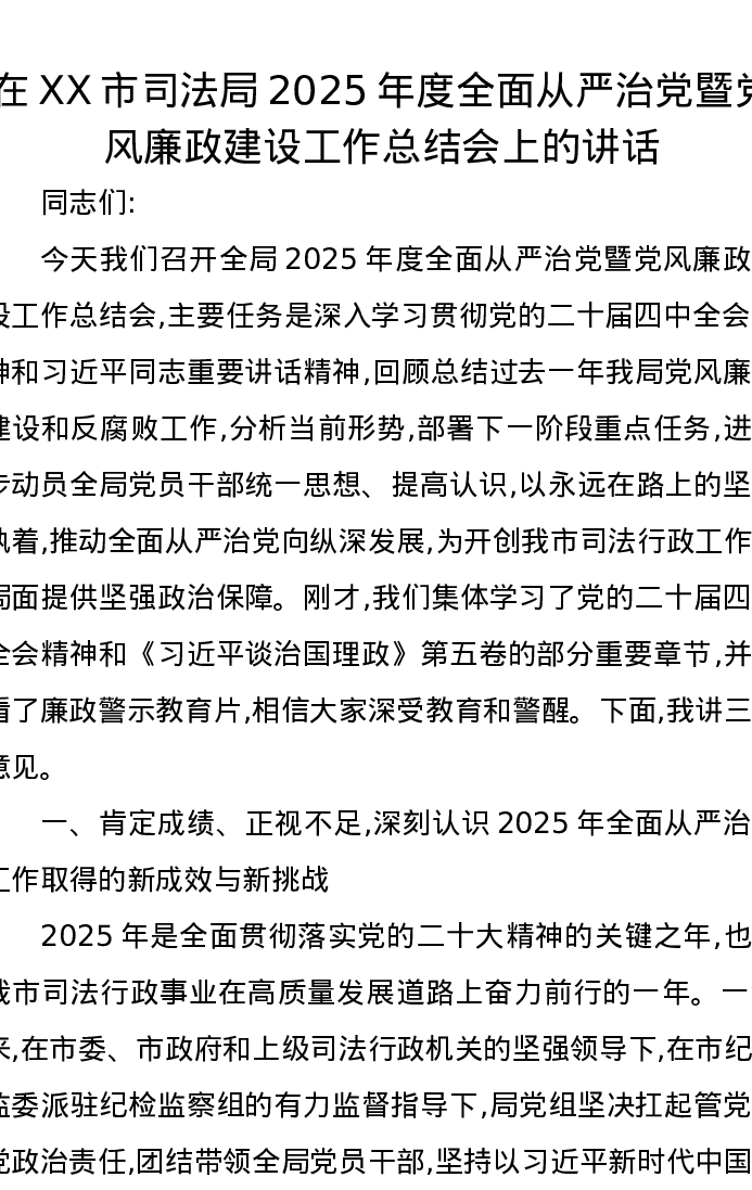 在XX市司法局2025年度全面从严治党暨党风廉政建设工作总结会上的讲话