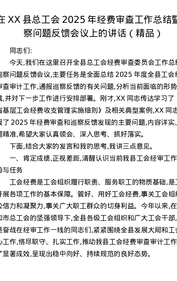 在XX县总工会2025年经费审查工作总结暨巡察问题反馈会议上的讲话