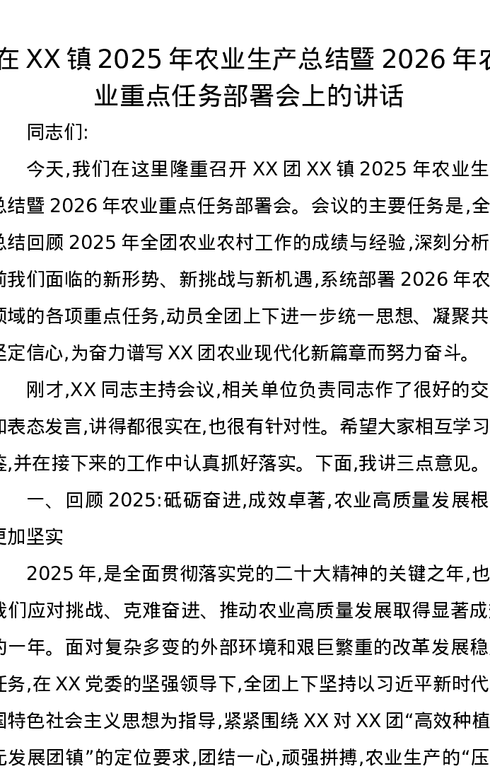 在XX镇2025年农业生产总结暨2026年农业重点任务部署会上的讲话