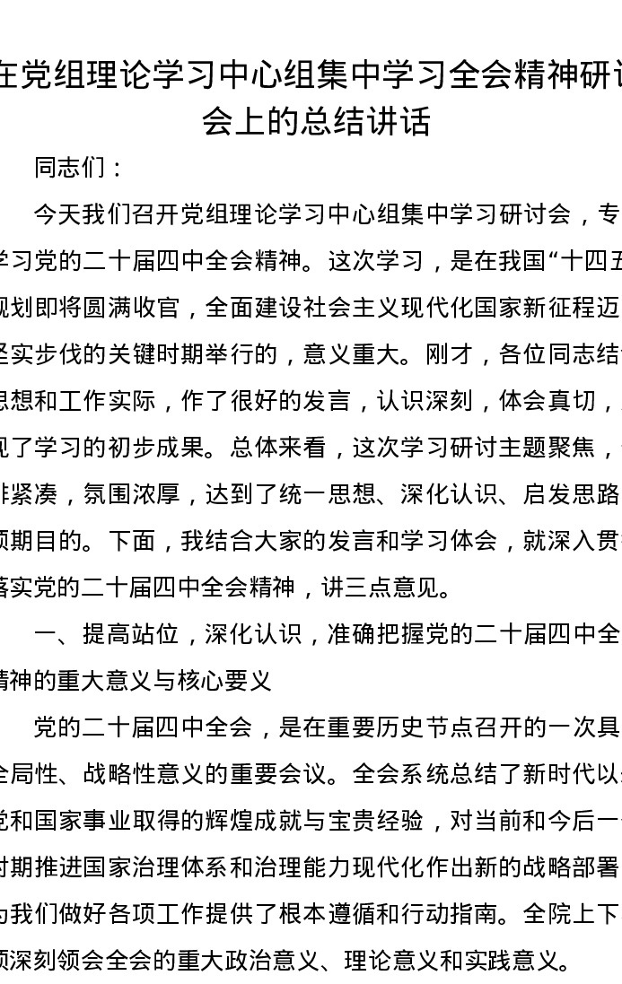 在党组理论学习中心组集中学习全会精神研讨会上的总结讲话