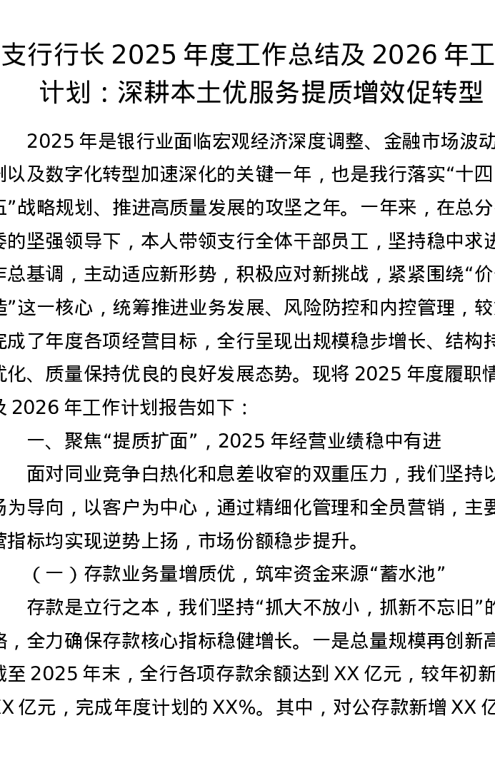支行行长2025年度工作总结及2026年工作计划:深耕本土优服务 提质增效促转型