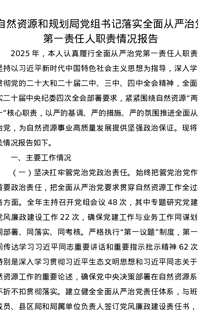 自然资源和规划局党组书记落实全面从严治党第一责任人职责情况报告