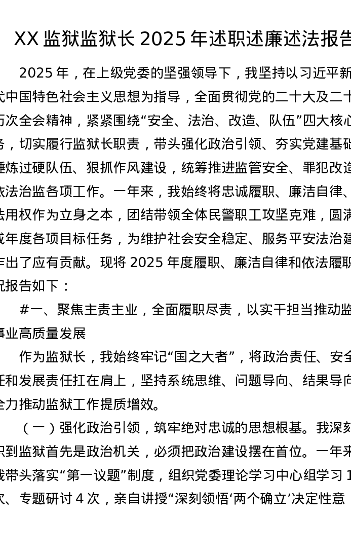 XX监狱监狱长2025年述职述廉述法报告(3919字)
