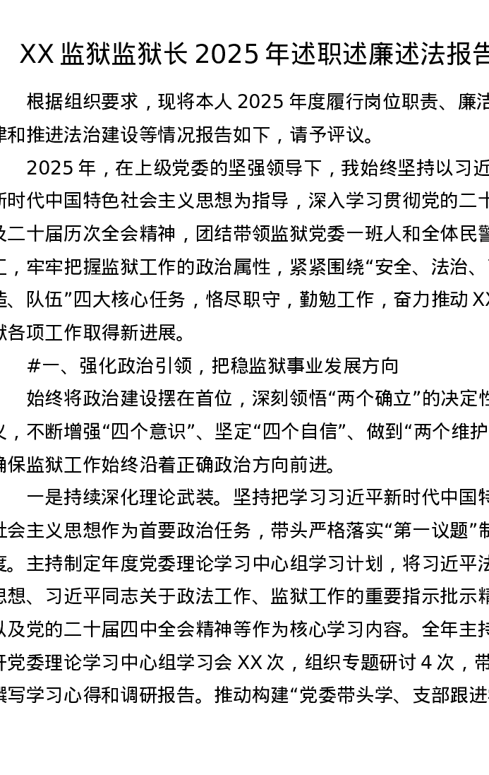 XX监狱监狱长2025年述职述廉述法报告