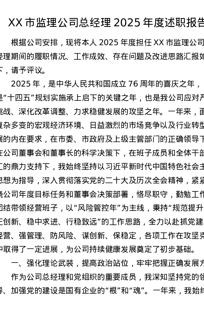 XX市监理公司总经理2025年度述职报告(5079字)