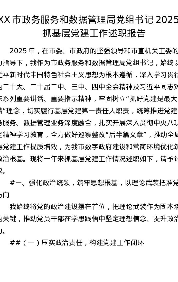 XX市政务服务和数据管理局党组书记2025年抓基层党建工作述职报告(6068字)