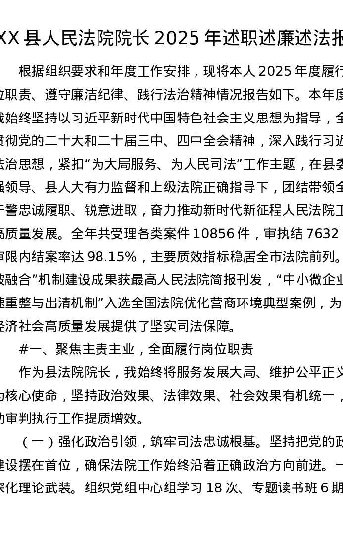 XX县人民法院院长2025年述职述廉述法报告