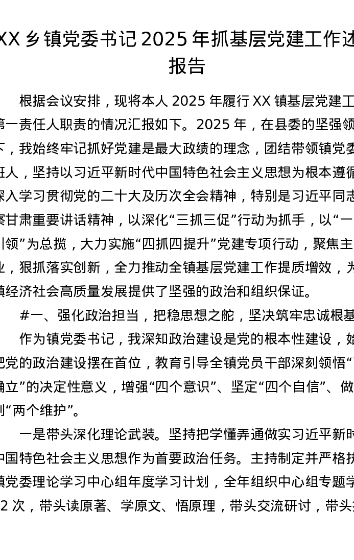 XX乡镇党委书记2025年抓基层党建工作述职报告(4442字)