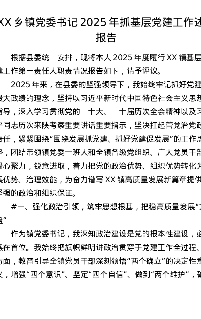 XX乡镇党委书记2025年抓基层党建工作述职报告(4591字)