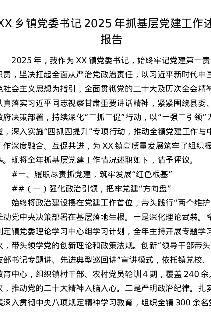 XX乡镇党委书记2025年抓基层党建工作述职报告(5021字)