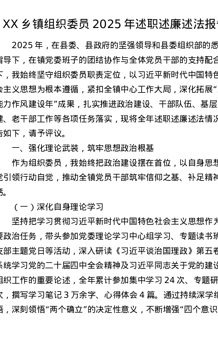 XX乡镇组织委员2025年述职述廉述法报告(3938字)