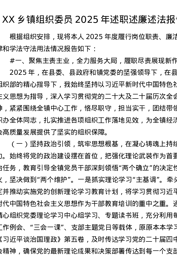 XX乡镇组织委员2025年述职述廉述法报告