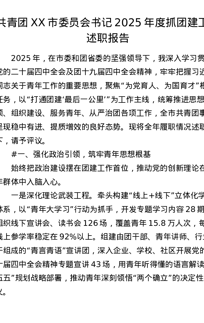 共青团XX市委员会书记2025年度抓团建工作述职报告(3320字)