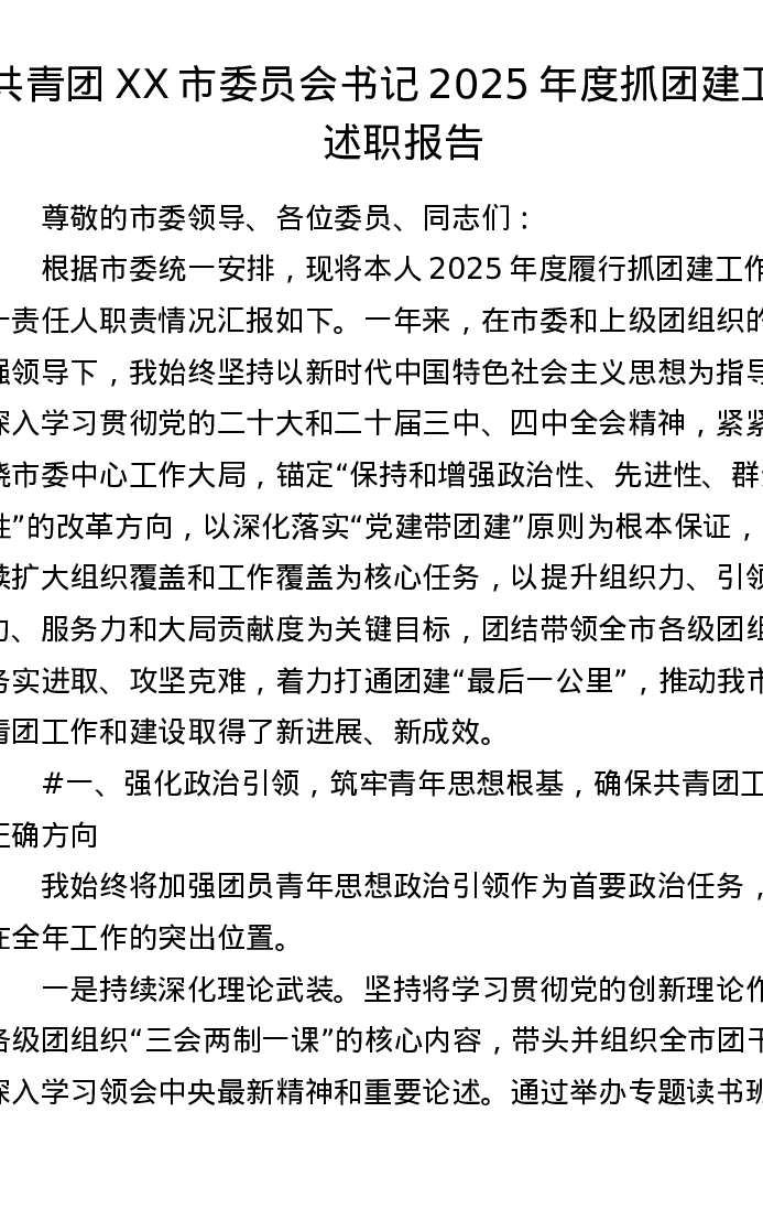 共青团XX市委员会书记2025年度抓团建工作述职报告(3912字)