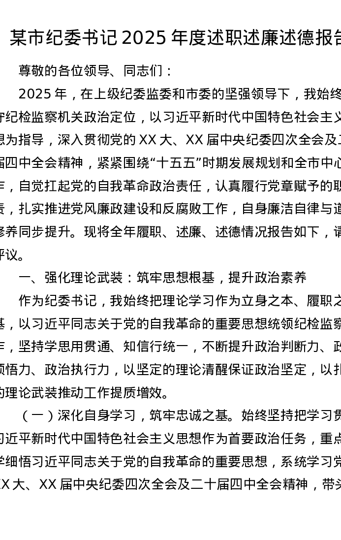某市纪委书记2025年度述职述廉述德报告