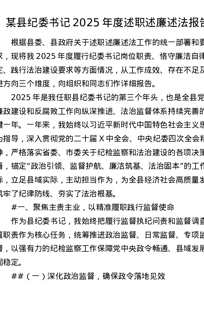 某县纪委书记2025年度述职述廉述法报告(5990字)