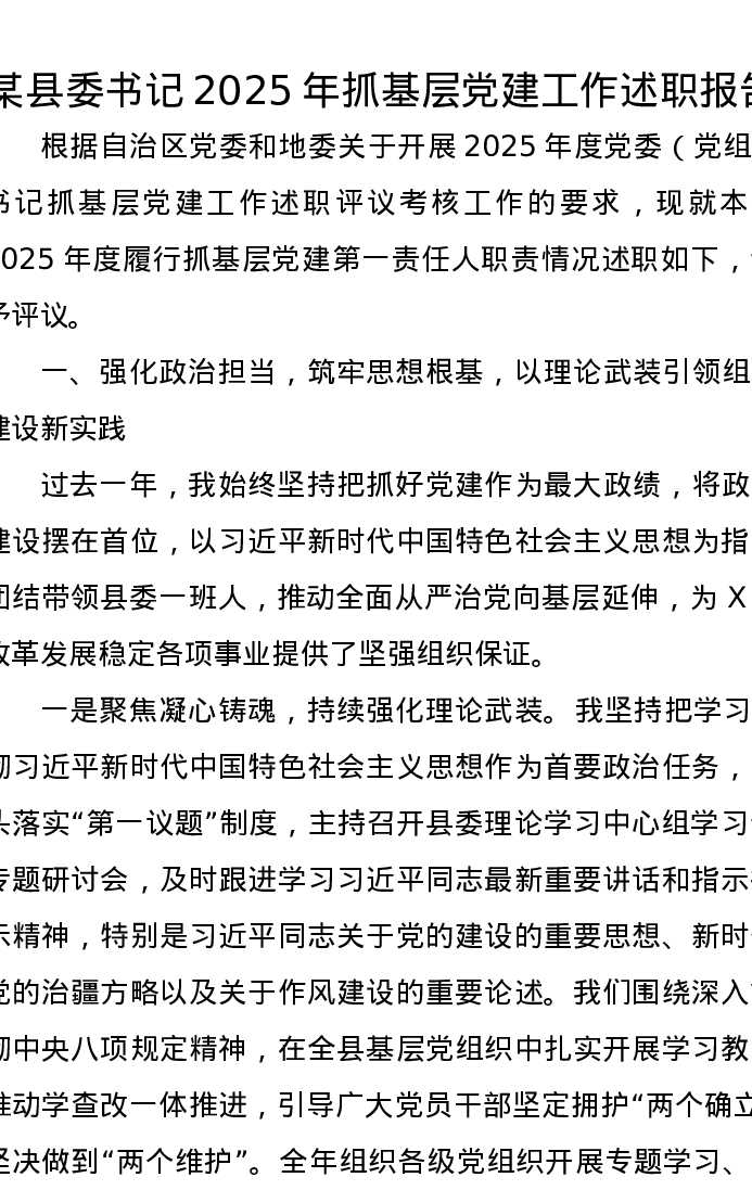 某县委书记2025年抓基层党建工作述职报告