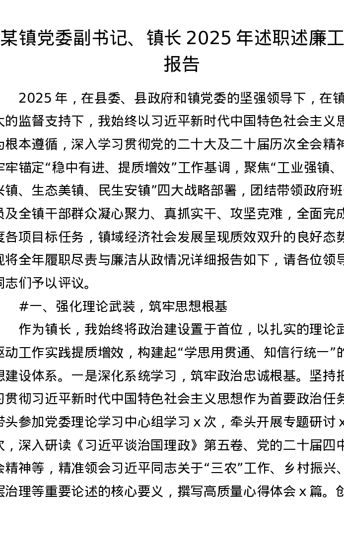 某镇党委副书记、镇长2025年述职述廉工作报告