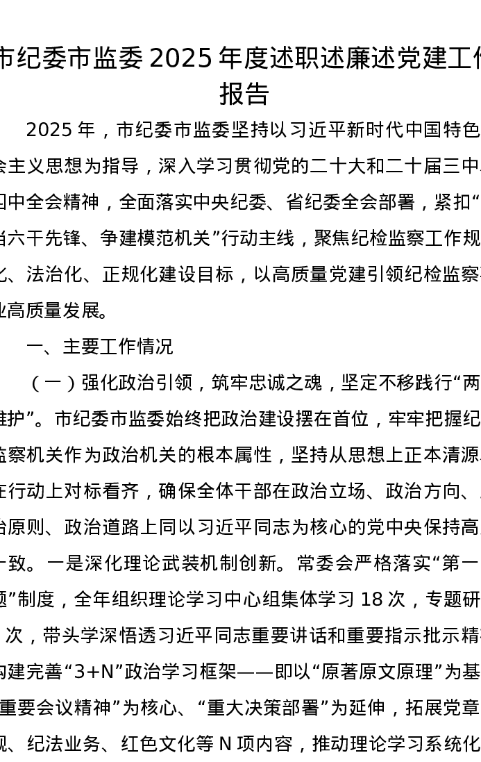 市纪委市监委2025年度述职述廉述党建工作报告