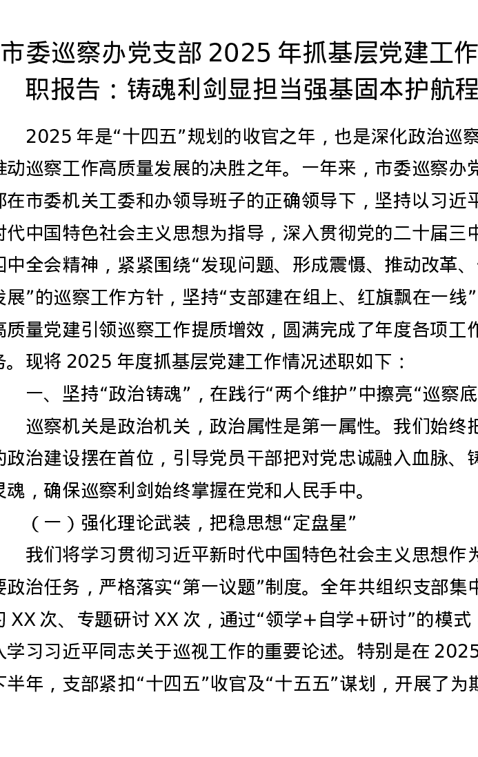 市委巡察办党支部2025年抓基层党建工作述职报告:铸魂利剑显担当 强基固本护航程