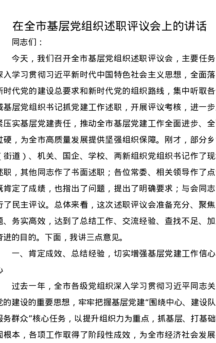 在全市基层党组织述职评议会上的讲话