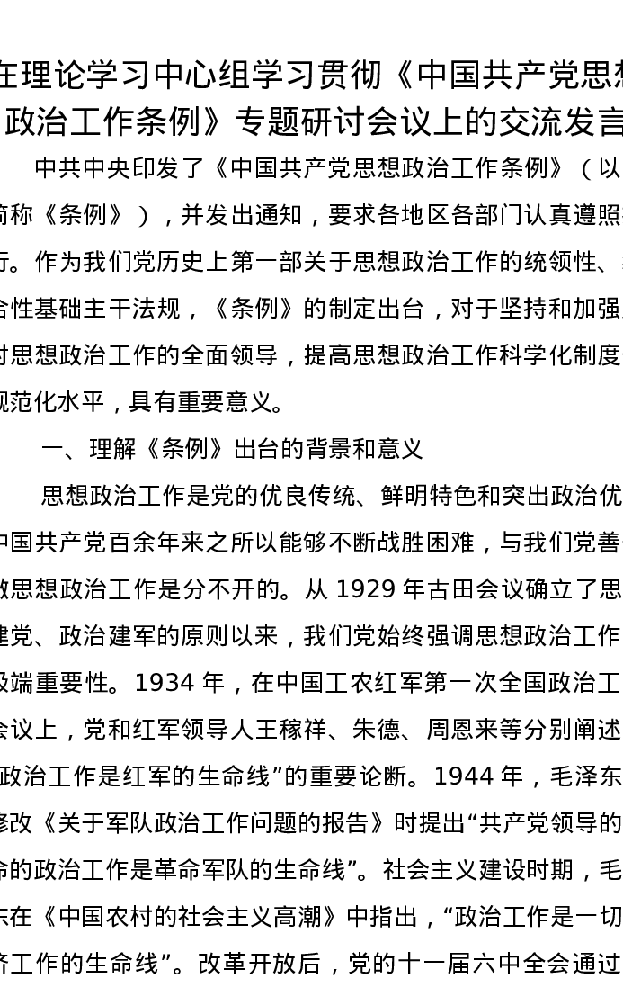 在理论学习中心组学习贯彻《中国共产党思想政治工作条例》专题研讨会议上的交流发言