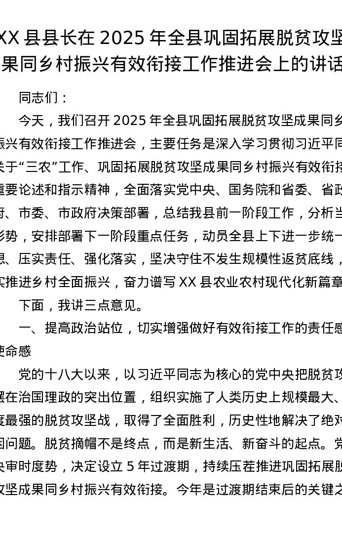 XX县县长在2025年全县巩固拓展脱贫攻坚成果同乡村振兴有效衔接工作推进会上的讲话1