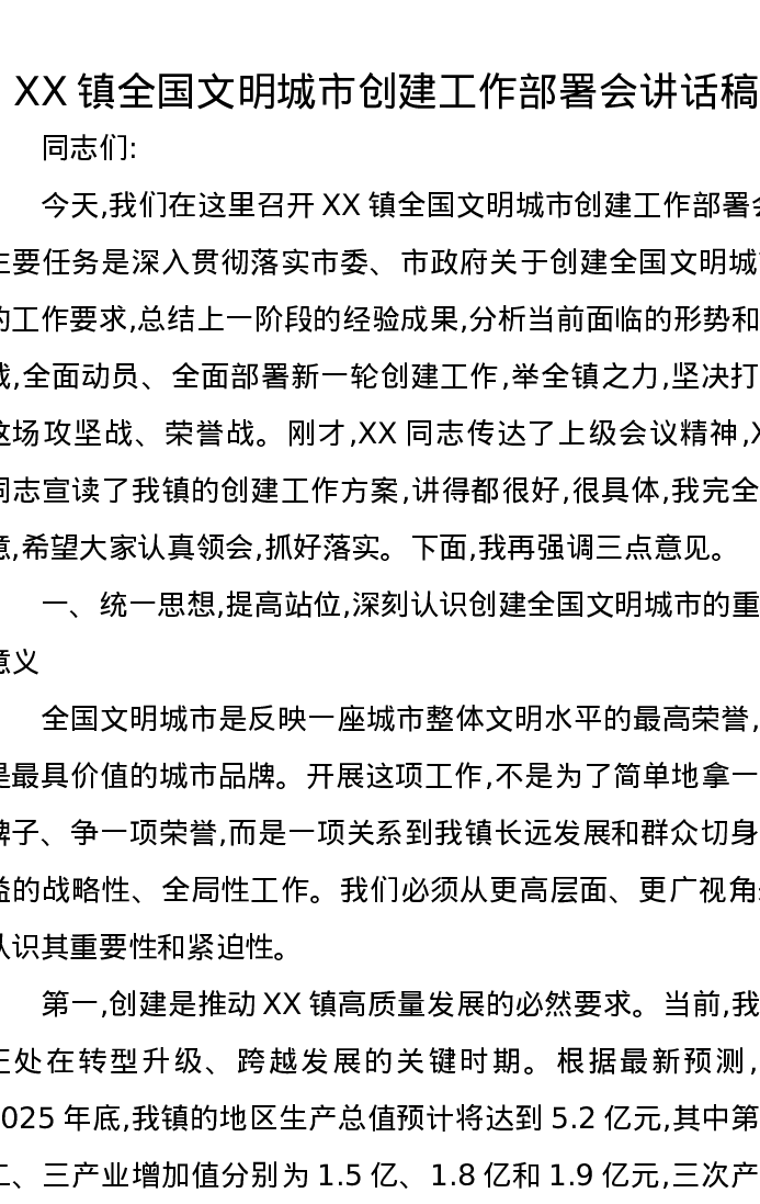 XX镇全国文明城市创建工作部署会讲话稿