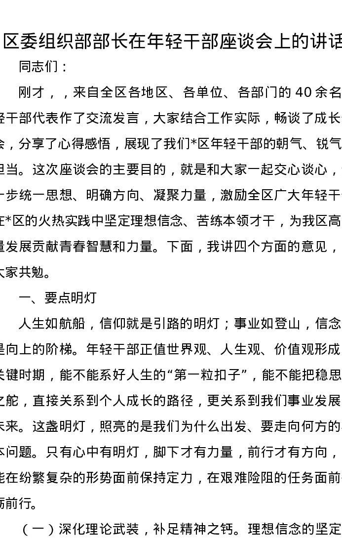 区委组织部部长在年轻干部座谈会上的讲话