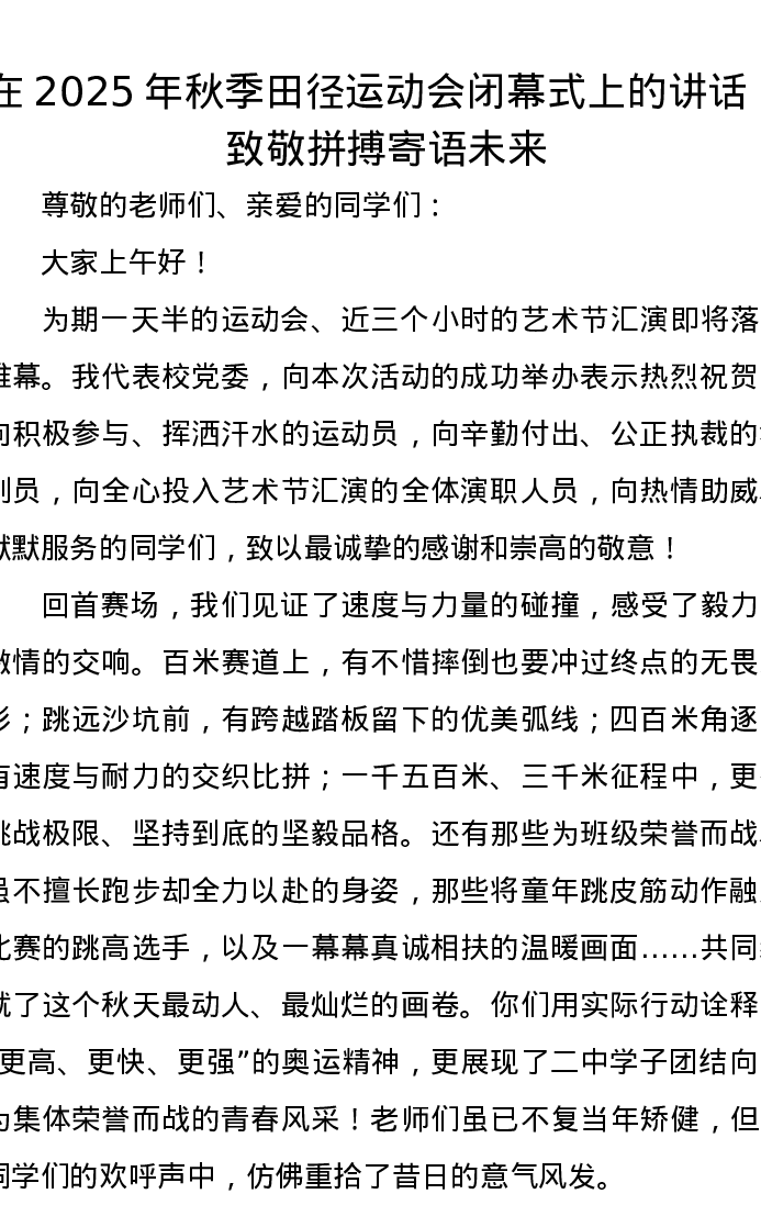 在2025年秋季田径运动会闭幕式上的讲话:致敬拼搏寄语未来