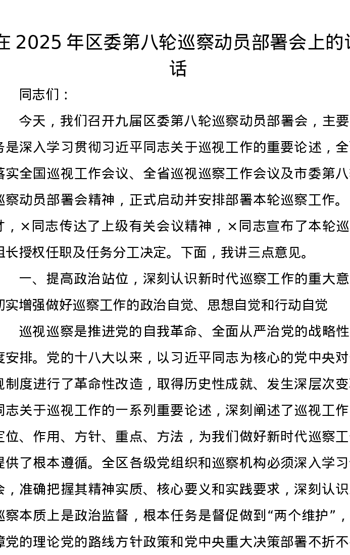 在2025年区委第八轮巡察动员部署会上的讲话