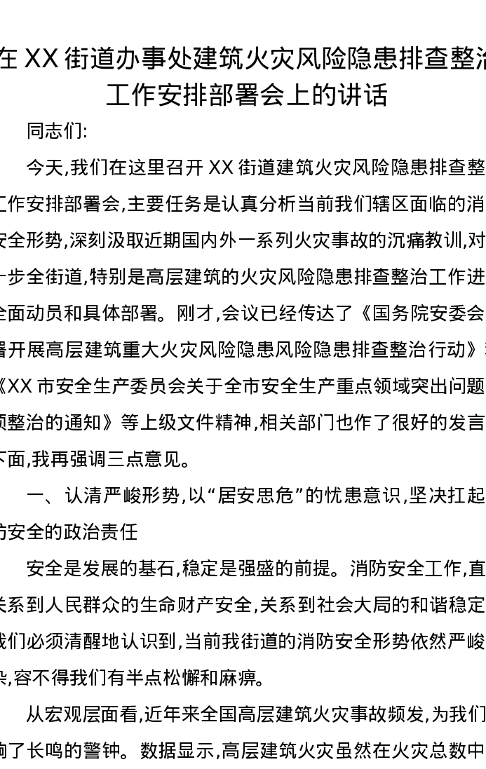 在XX街道办事处建筑火灾风险隐患排查整治工作安排部署会上的讲话