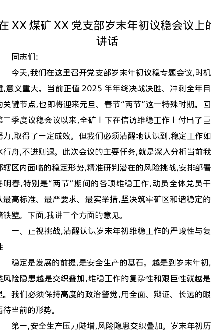 在XX煤矿XX党支部岁末年初议稳会议上的讲话