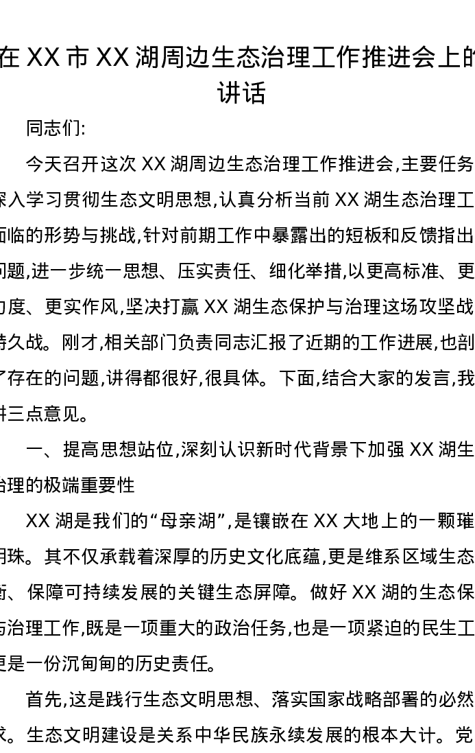 在XX市XX湖周边生态治理工作推进会上的讲话