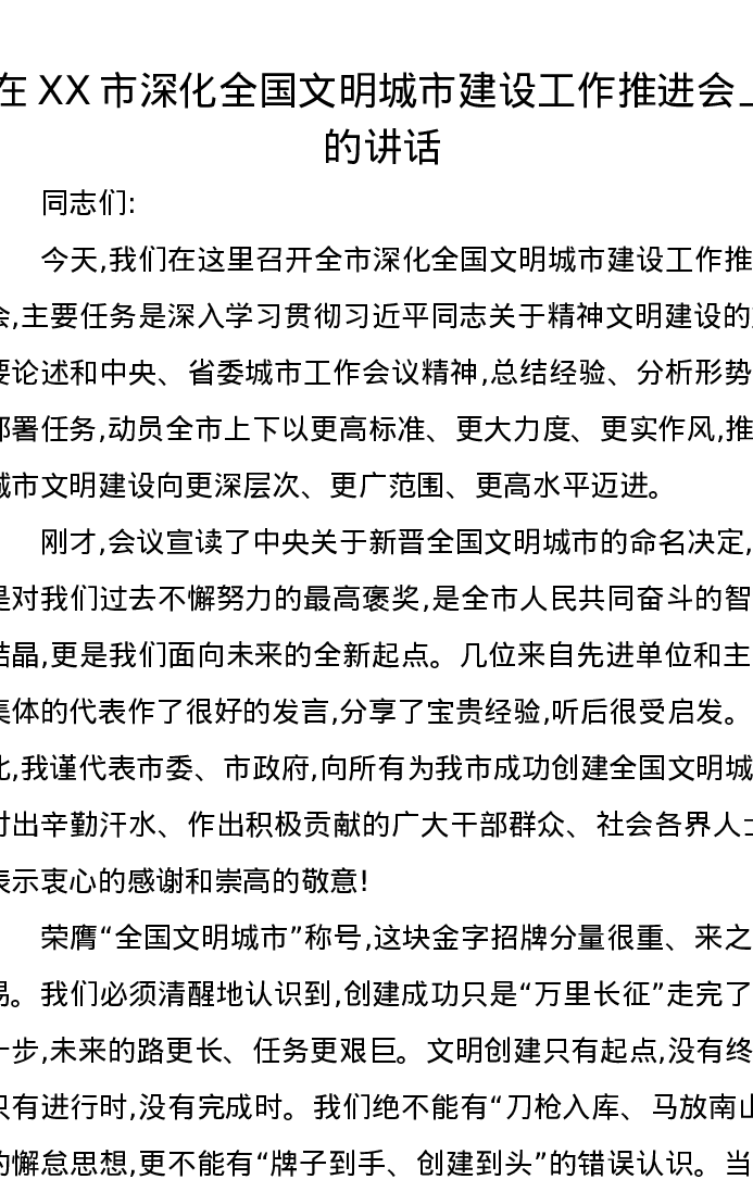 在XX市深化全国文明城市建设工作推进会上的讲话