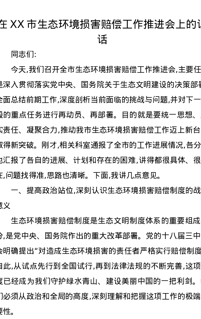 在XX市生态环境损害赔偿工作推进会上的讲话