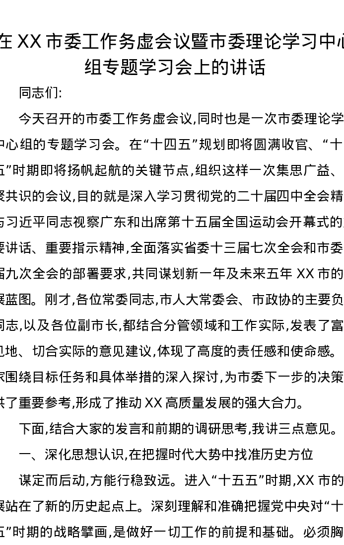 在XX市委工作务虚会议暨市委理论学习中心组专题学习会上的讲话