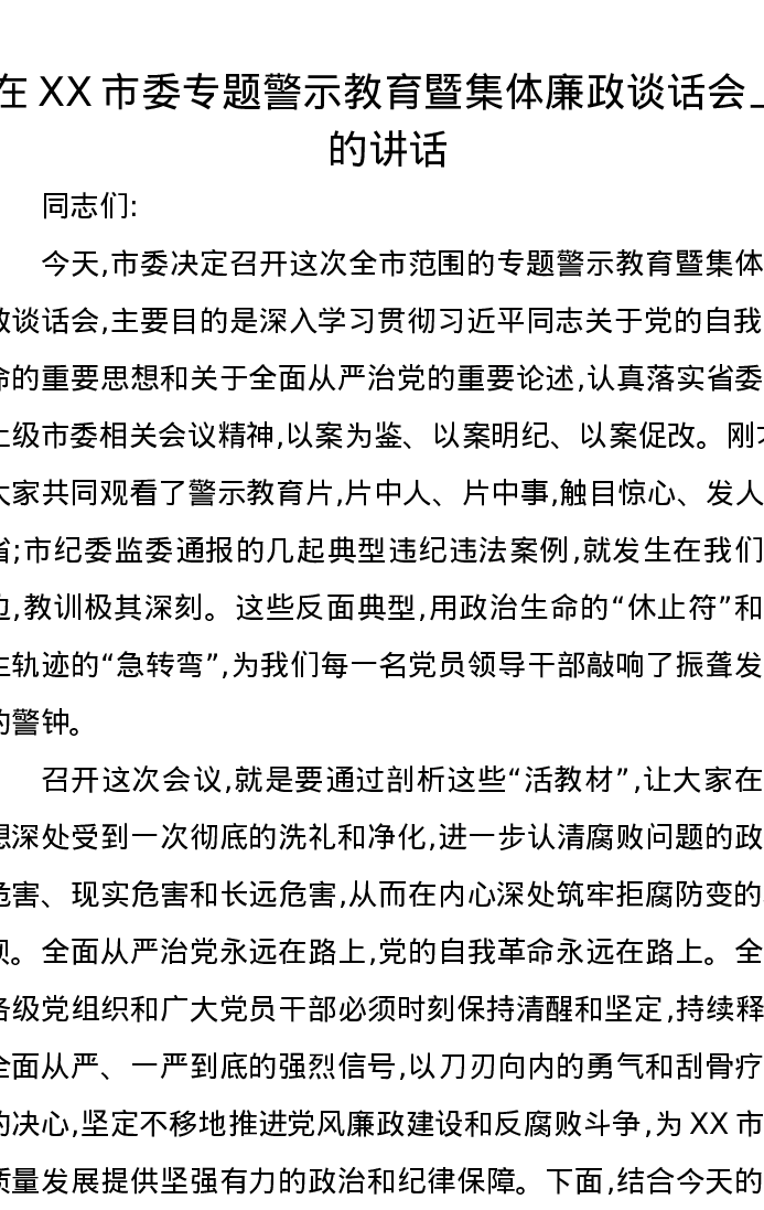 在XX市委专题警示教育暨集体廉政谈话会上的讲话