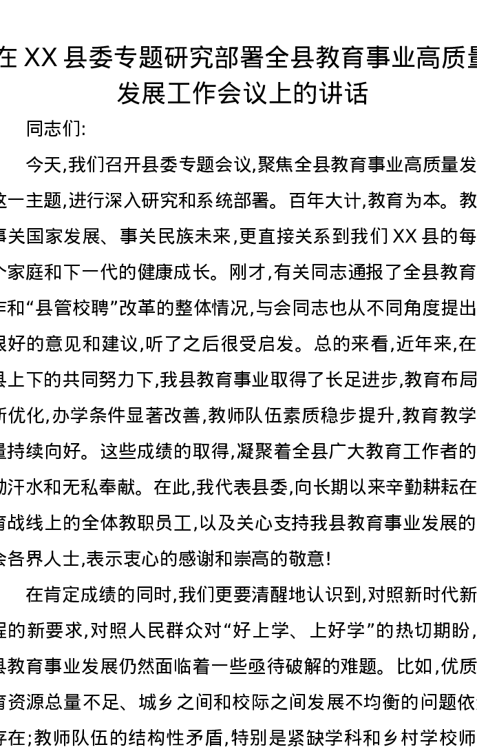 在XX县委专题研究部署全县教育事业高质量发展工作会议上的讲话2