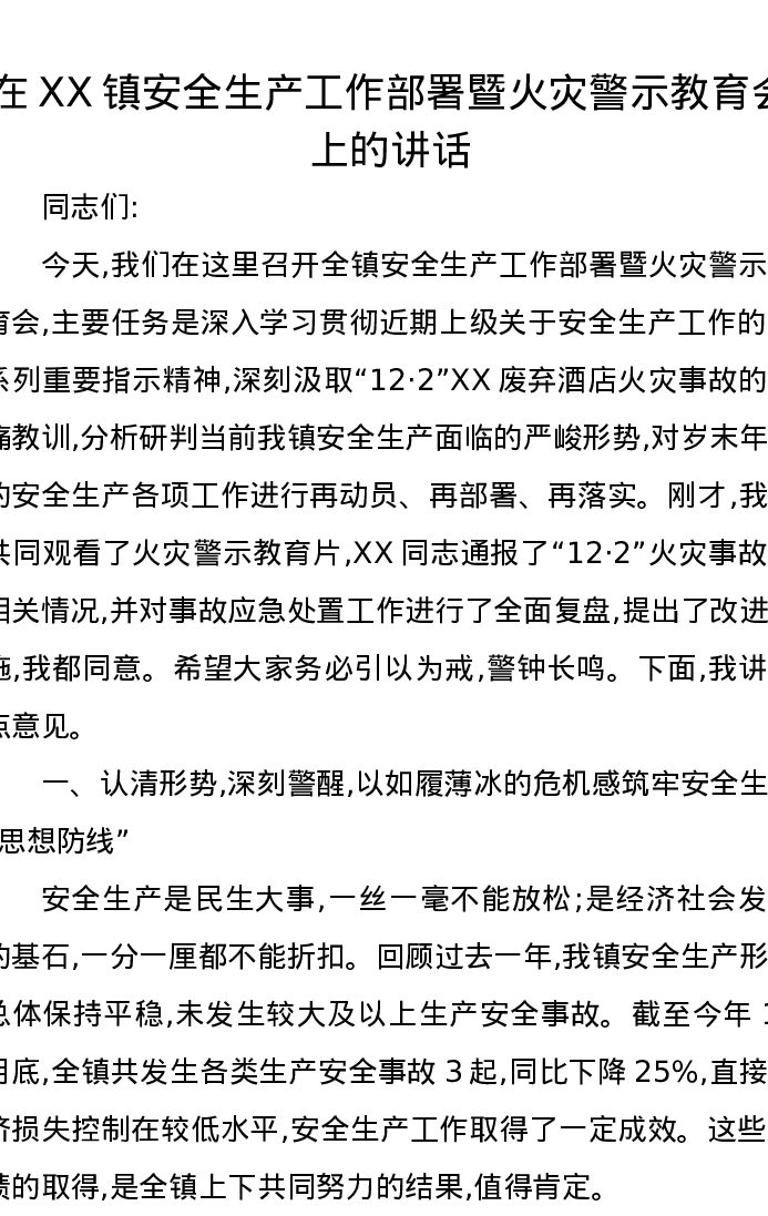 在XX镇安全生产工作部署暨火灾警示教育会上的讲话