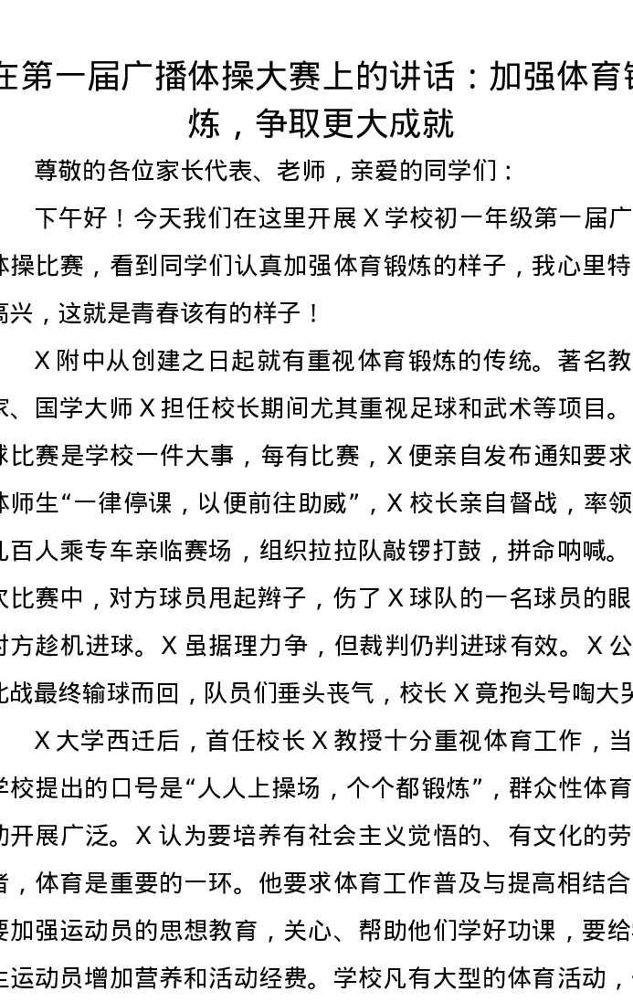 在第一届广播体操大赛上的讲话:加强体育锻炼,争取更大成就